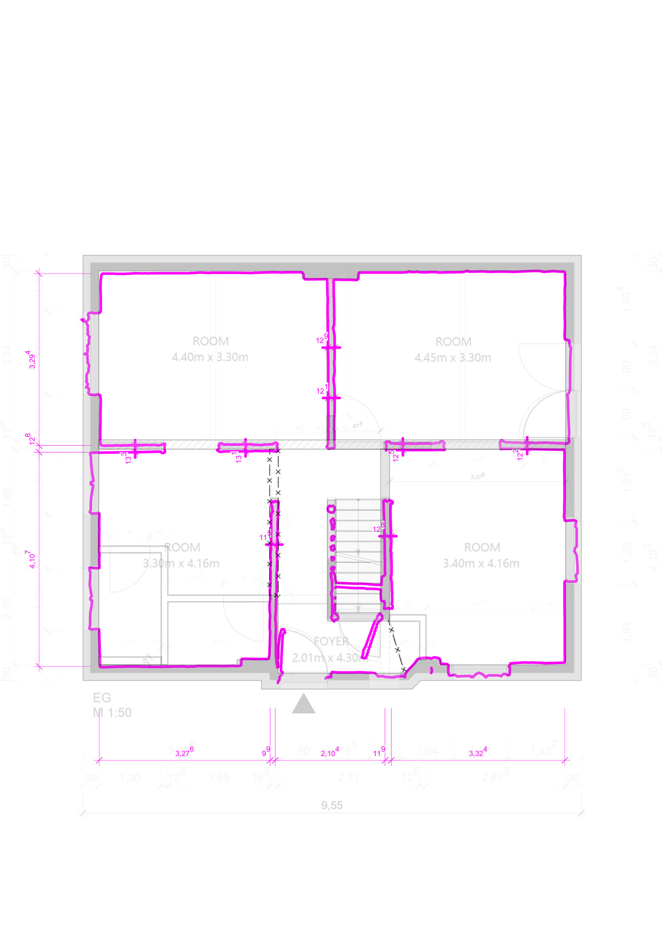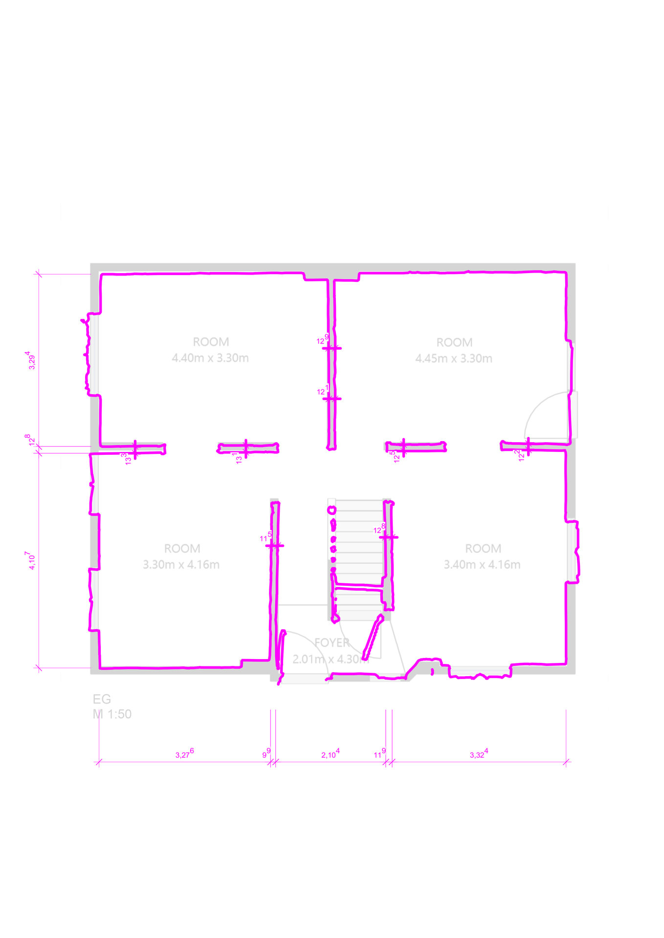 Wir erstellen Ihnen verformungsgerechte Grundrisse und Schnitte an beliebigen Positionen und übermitteln sie Ihnen als 2D-CAD-Export in Form von DWG- oder DXF-Dateien.